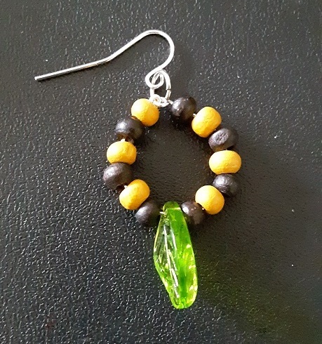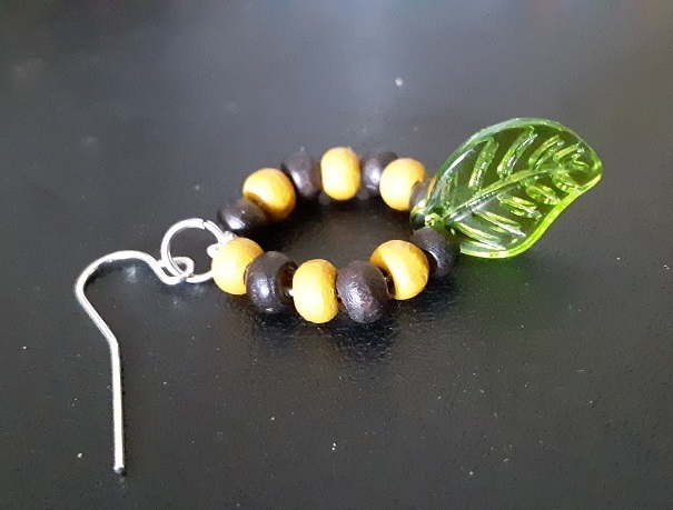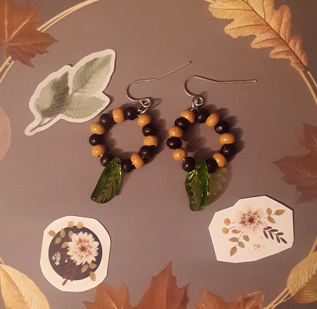 A sweet little pair of forest-themed earrings, made with wooden beads and glass leaf beads. Hooks are surgical steel.