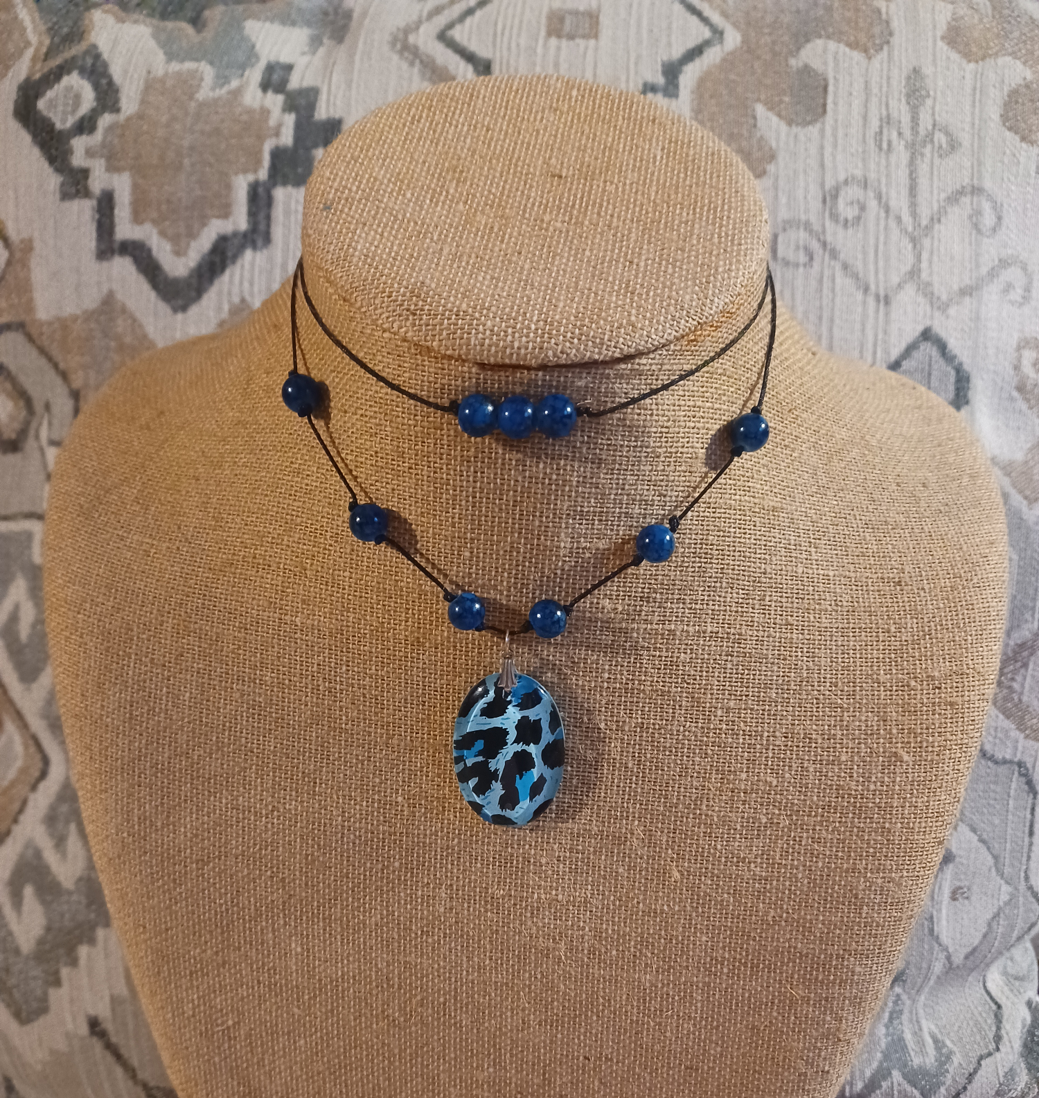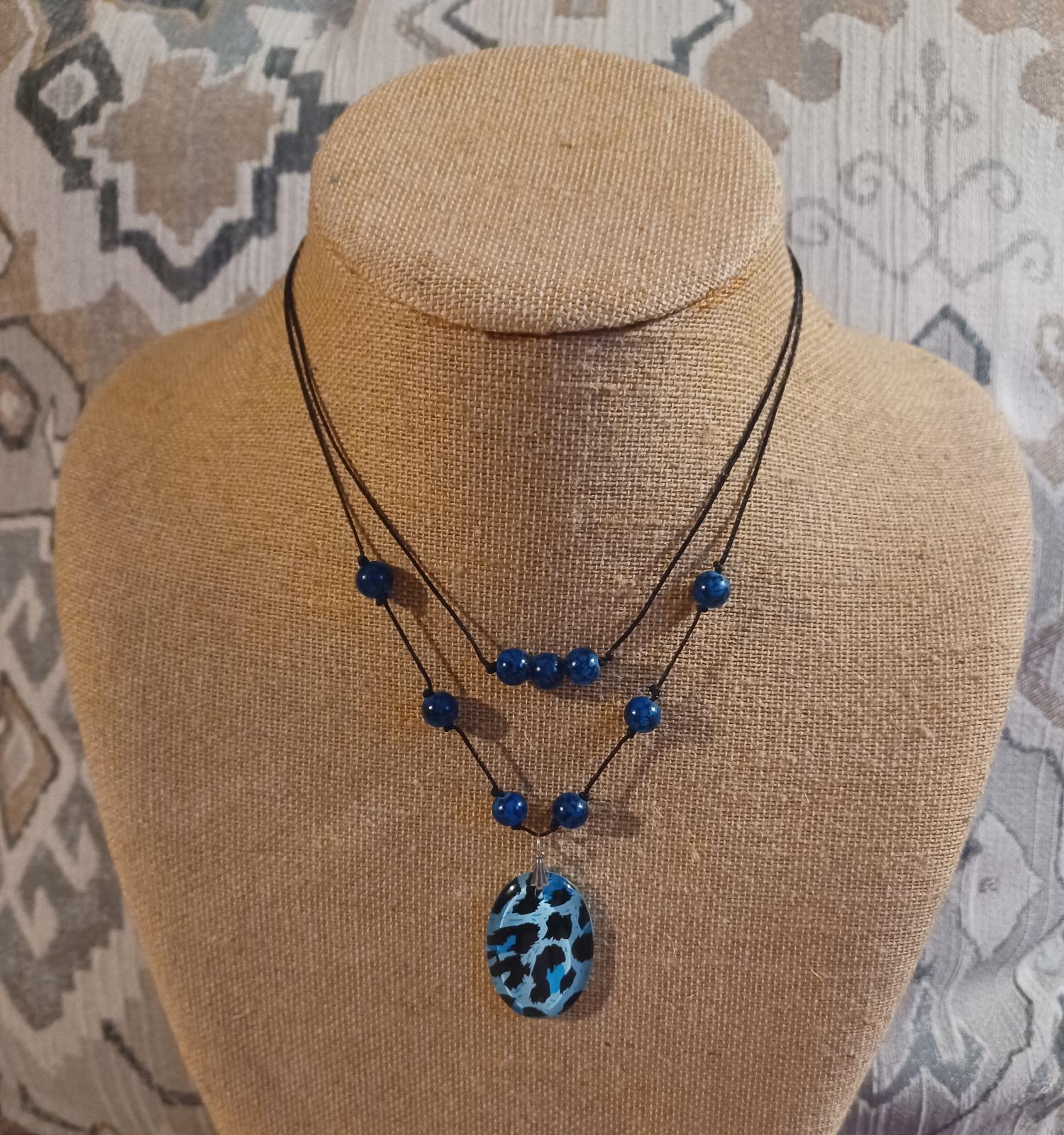 A blue animal-print pendant paired with dark-blue beads on a double-layered cord. A-woooo!