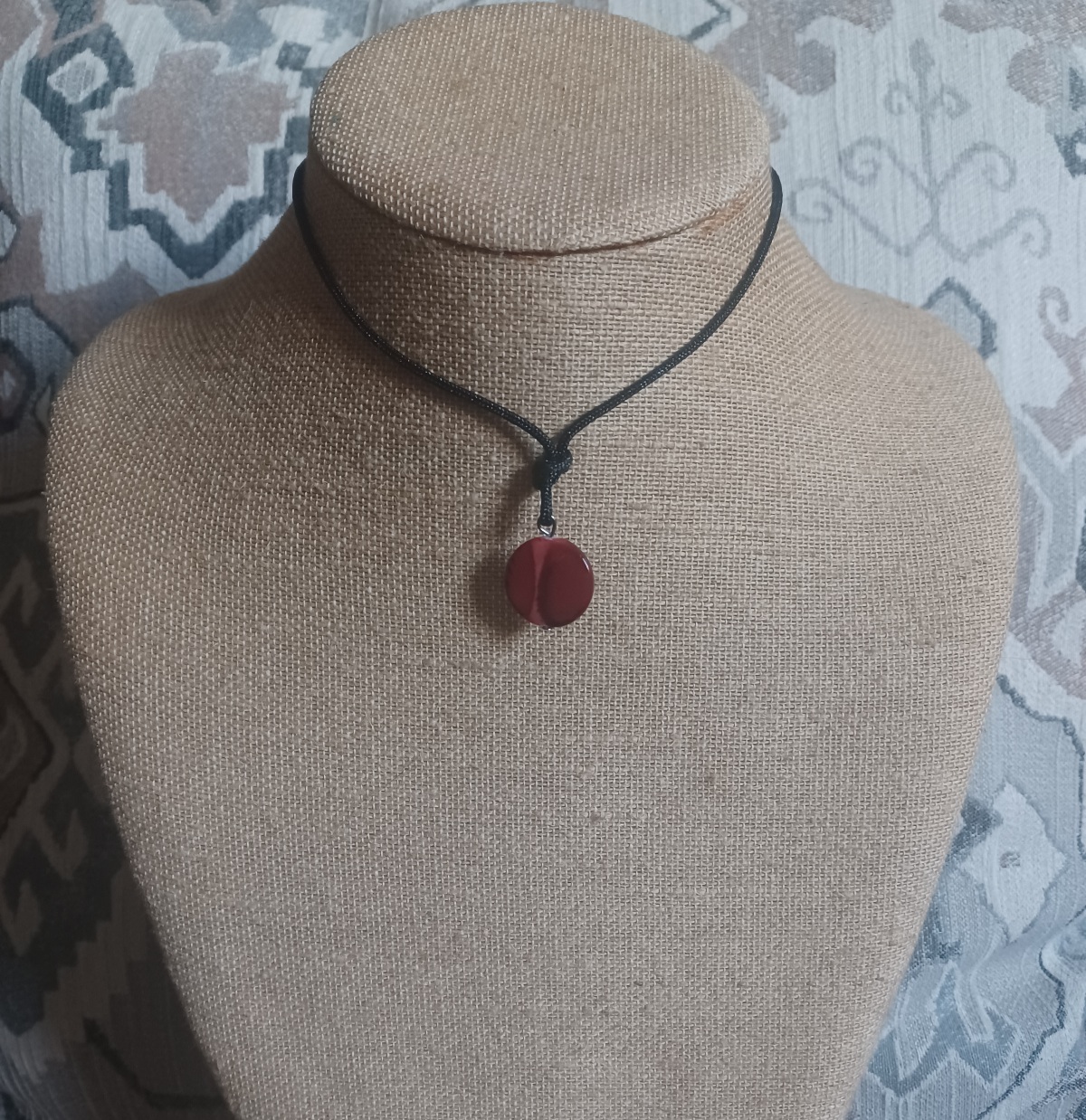 A red shell pendant fashioned on thick nylon cord.