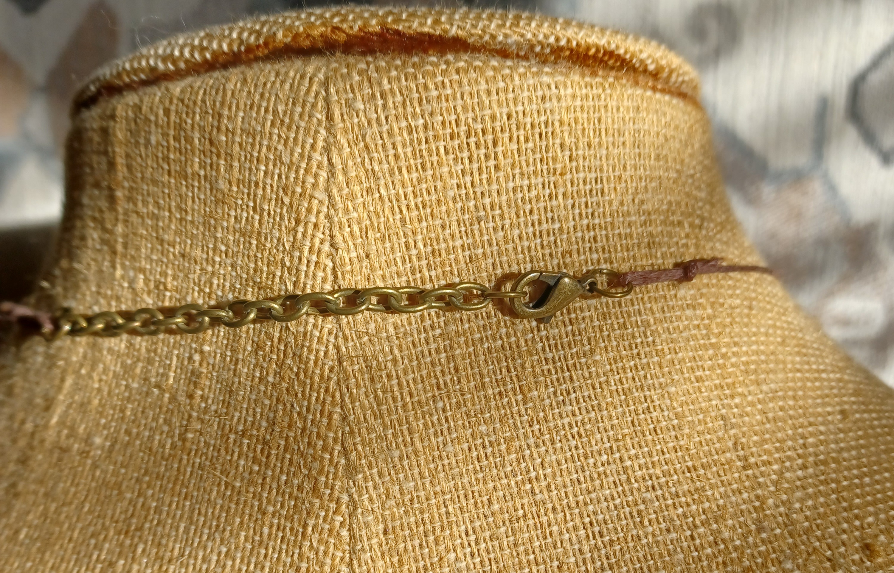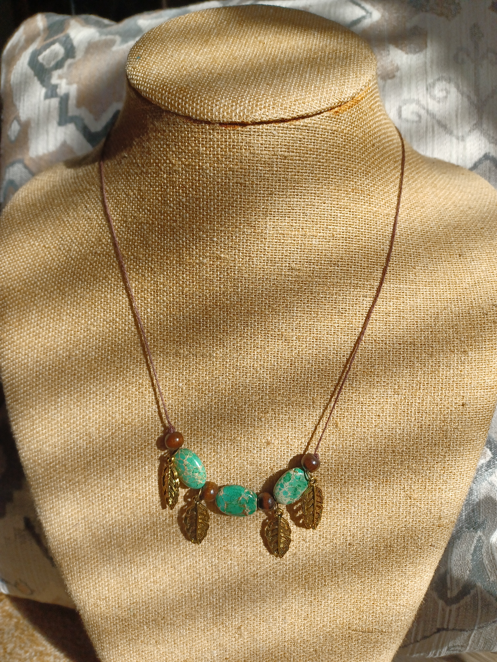 Made with stone and wooden beads with gold-colored leaf charms on a brown hemp cord.