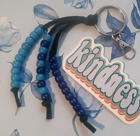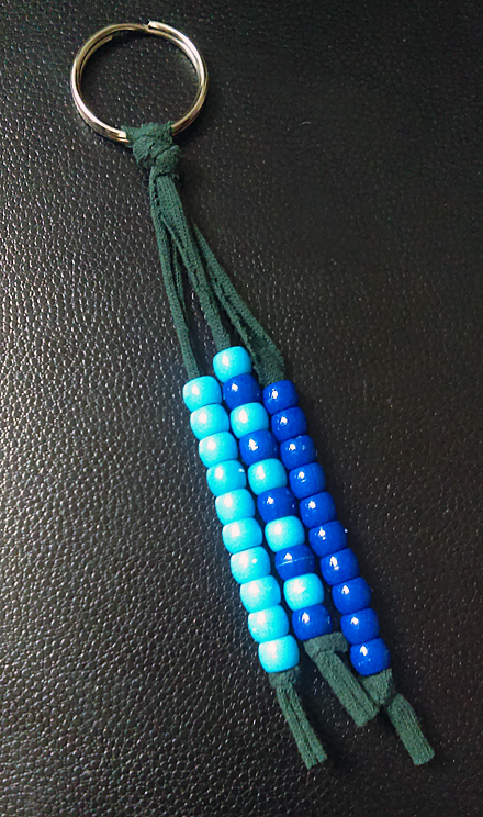 Made from an old dark green t-shirt and blue pony beads, this keychain provides a pop of color!