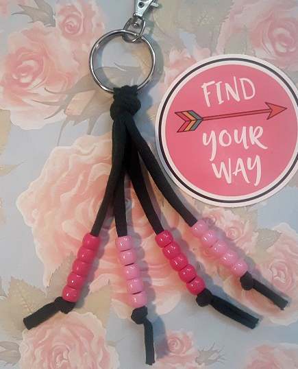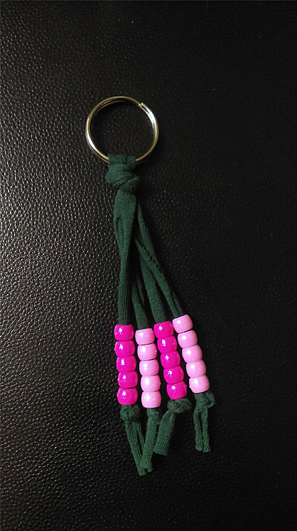 Made from an old dark green t-shirt and pink pony beads, this keychain provides a pop of color!