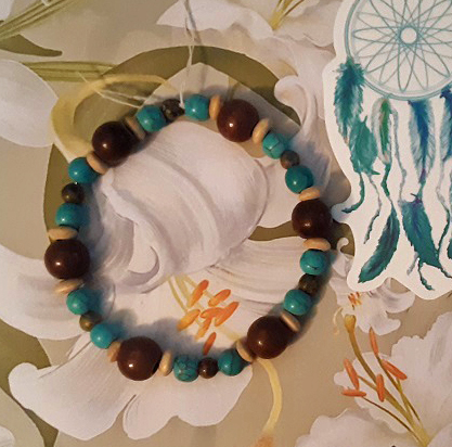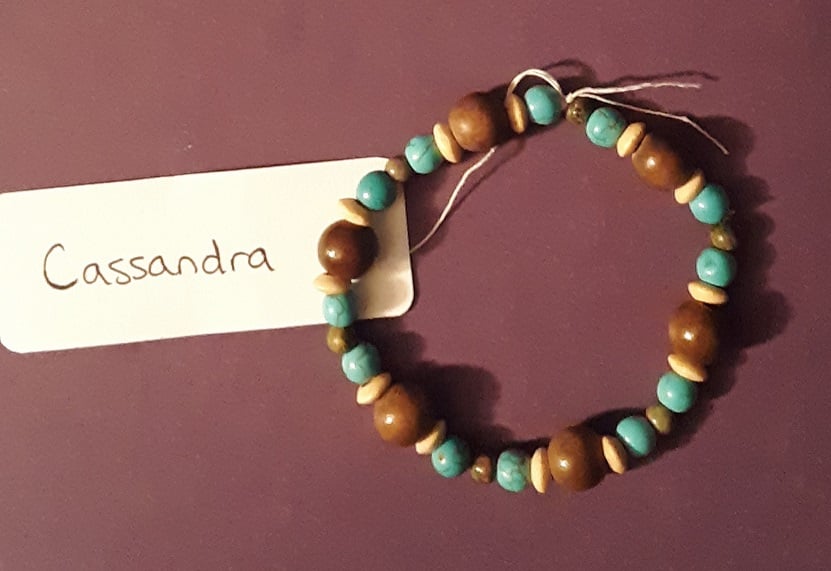 A bracelet made of turquoise, wood, and jasper, inspired by the name "Cassandra".