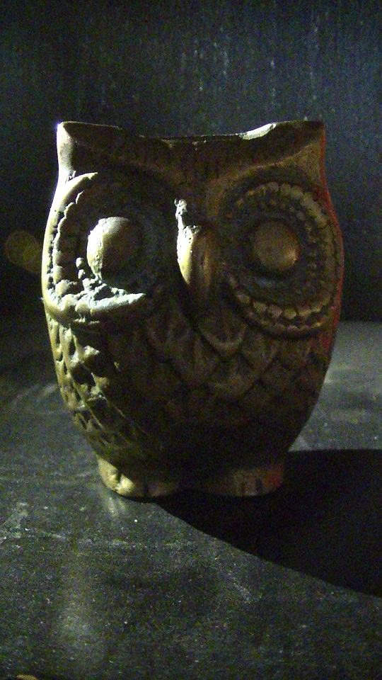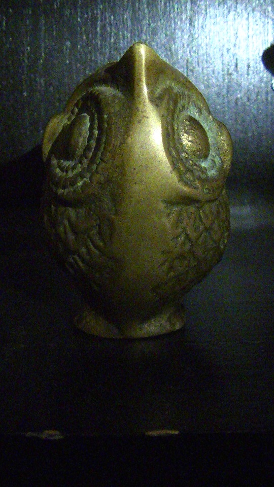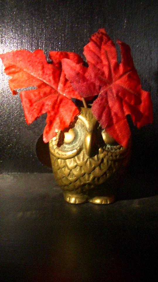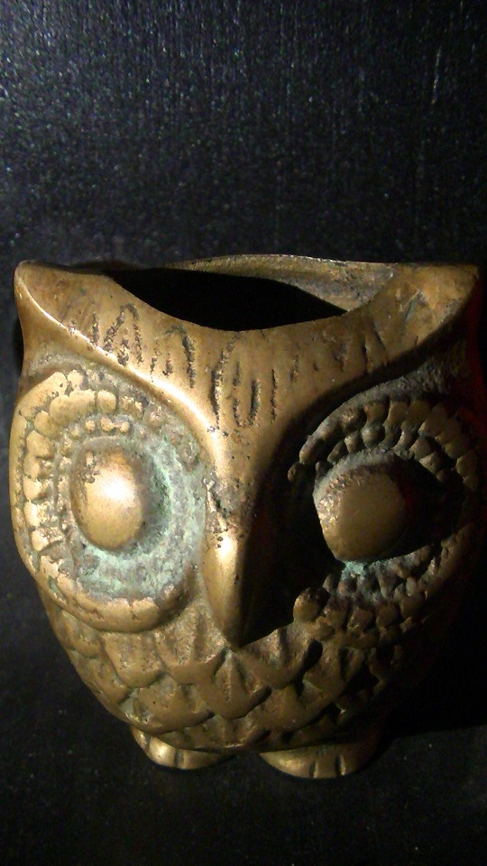 This little owl fits in the palm of your hand! It's made of brass and makes a great paper weight, but it can also function as a small vase (leaf decoration not included).