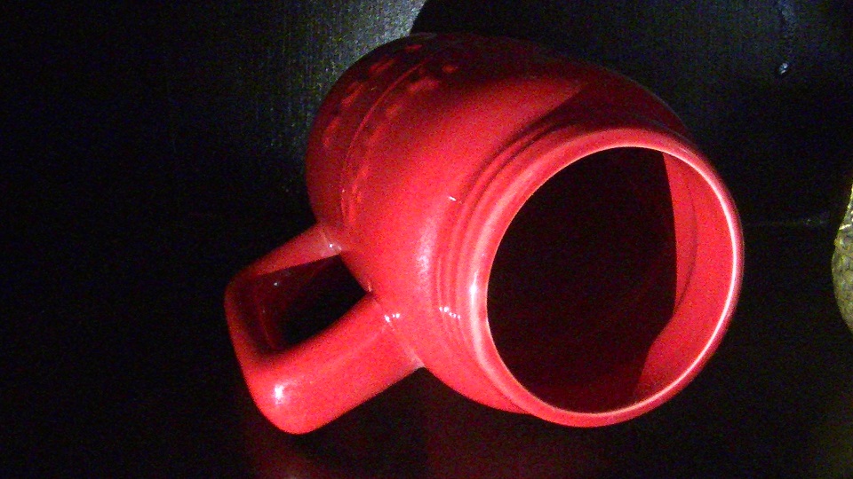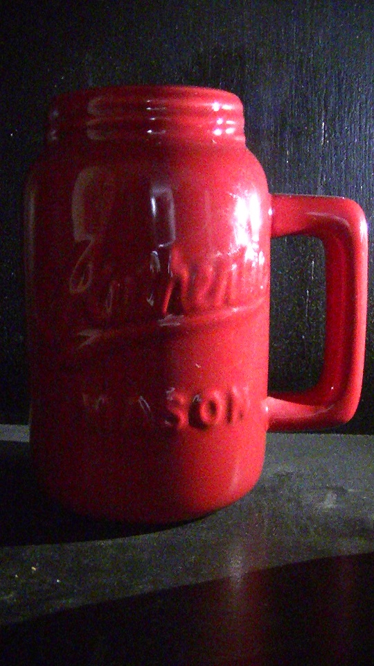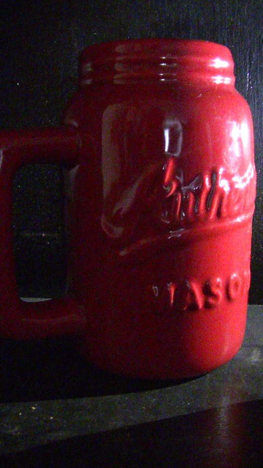 A red mug in the shape of a classic mason jar, great for coffee mug collectors! It is microwave-safe and dishwasher-safe, so it's fully functional as drinkware!