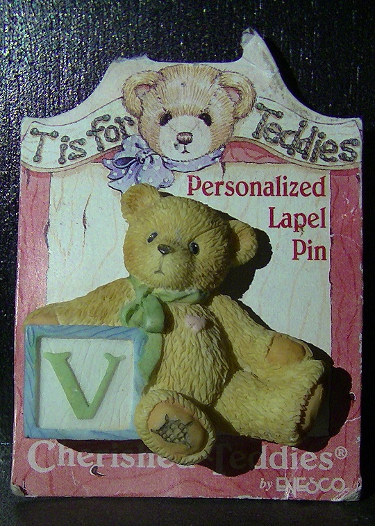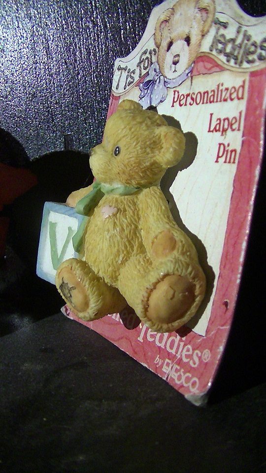A personalized teddy bear brooch with a "V" letter block. According to the copyright on the back, the brooch seems to be from the mid-90s. He is really adorable and is looking for his forever home!