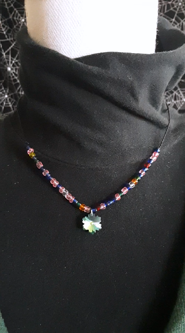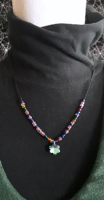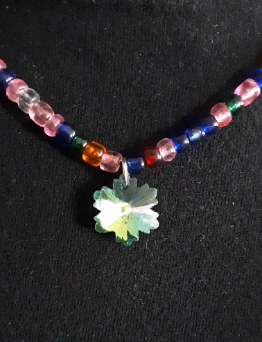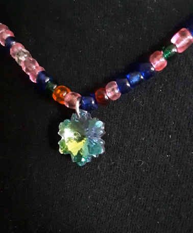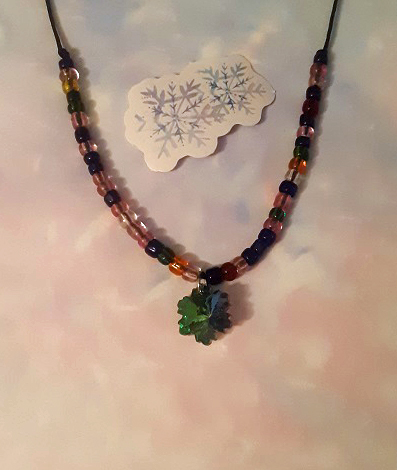 Made with glass beads and an iridescent snowflake charm. The necklace is also adjustable. (sticker included)