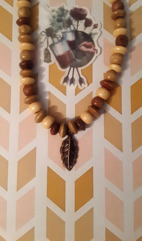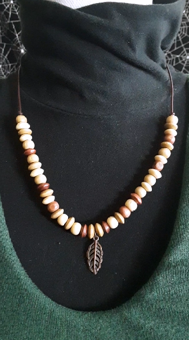 This adjustable necklace is made with wooden beads and a bronze-colored leaf charm. (sticker included)