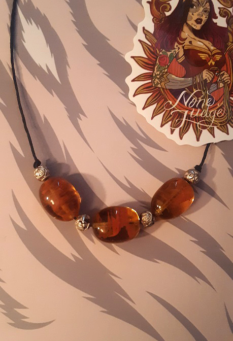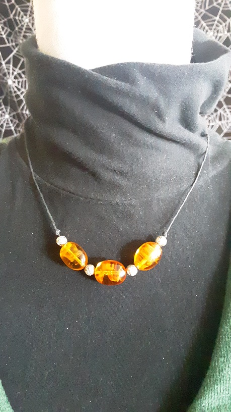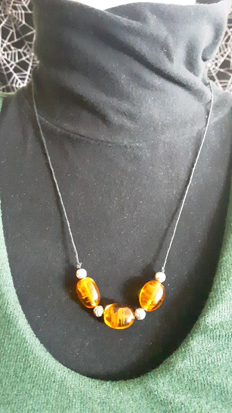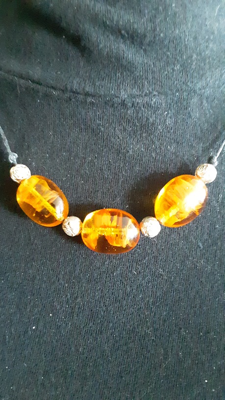 This adjustable necklace was made with fiery glass beads and metallic rose beads. (sticker included)