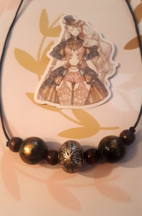 This adjustable necklace is made with wooden and painted wood beads with a metallic centerpiece. (sticker included!)