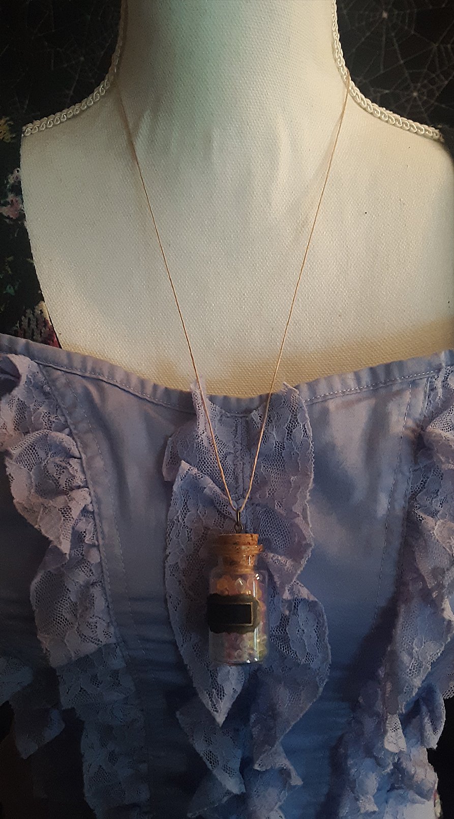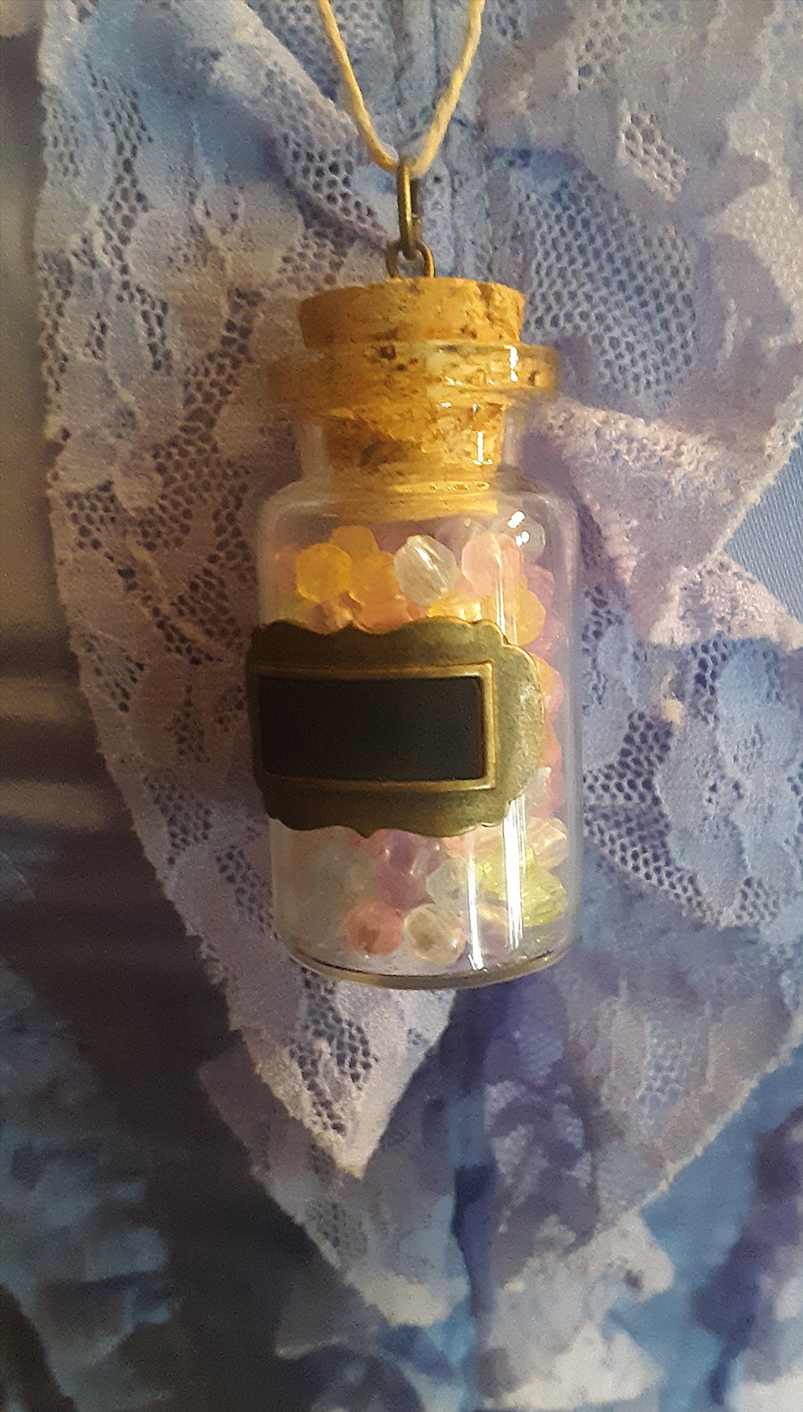 This necklace is made with acrylic crystalline beads inside a glass bottle on a natural cord. (sticker included!)