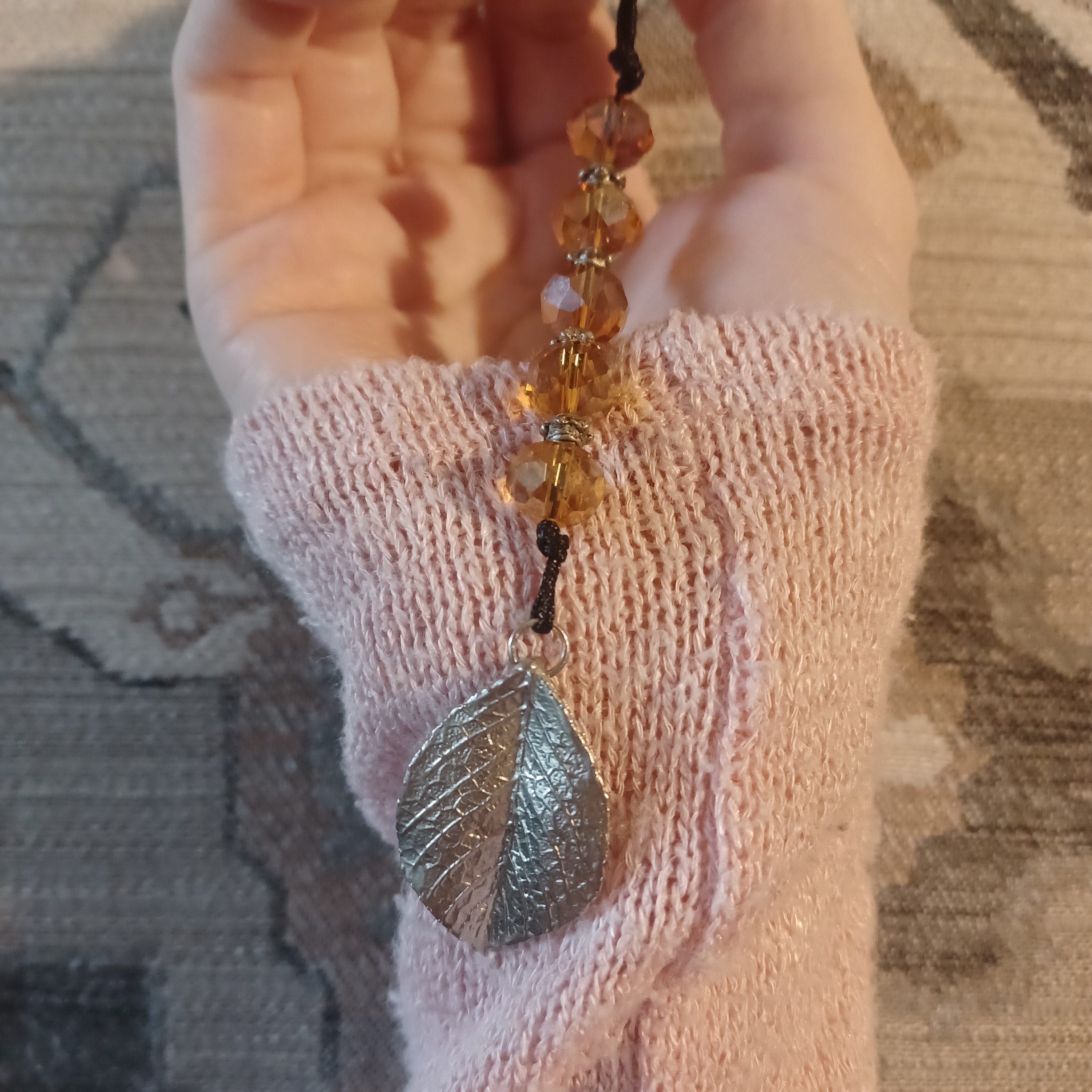 Made with glass and metallic beads with a metallic leaf charm. This is a one-of-a-kind item in the shop!