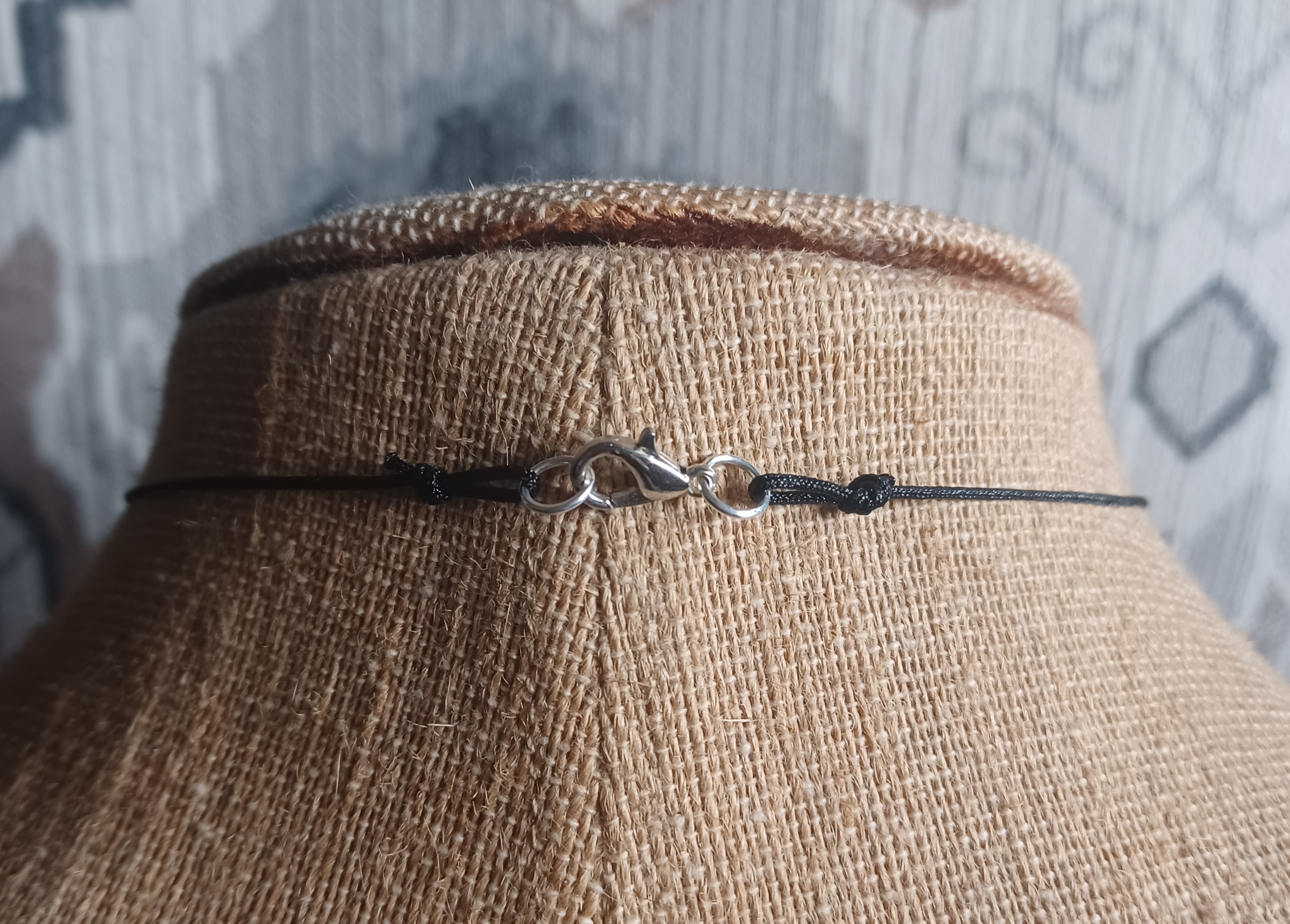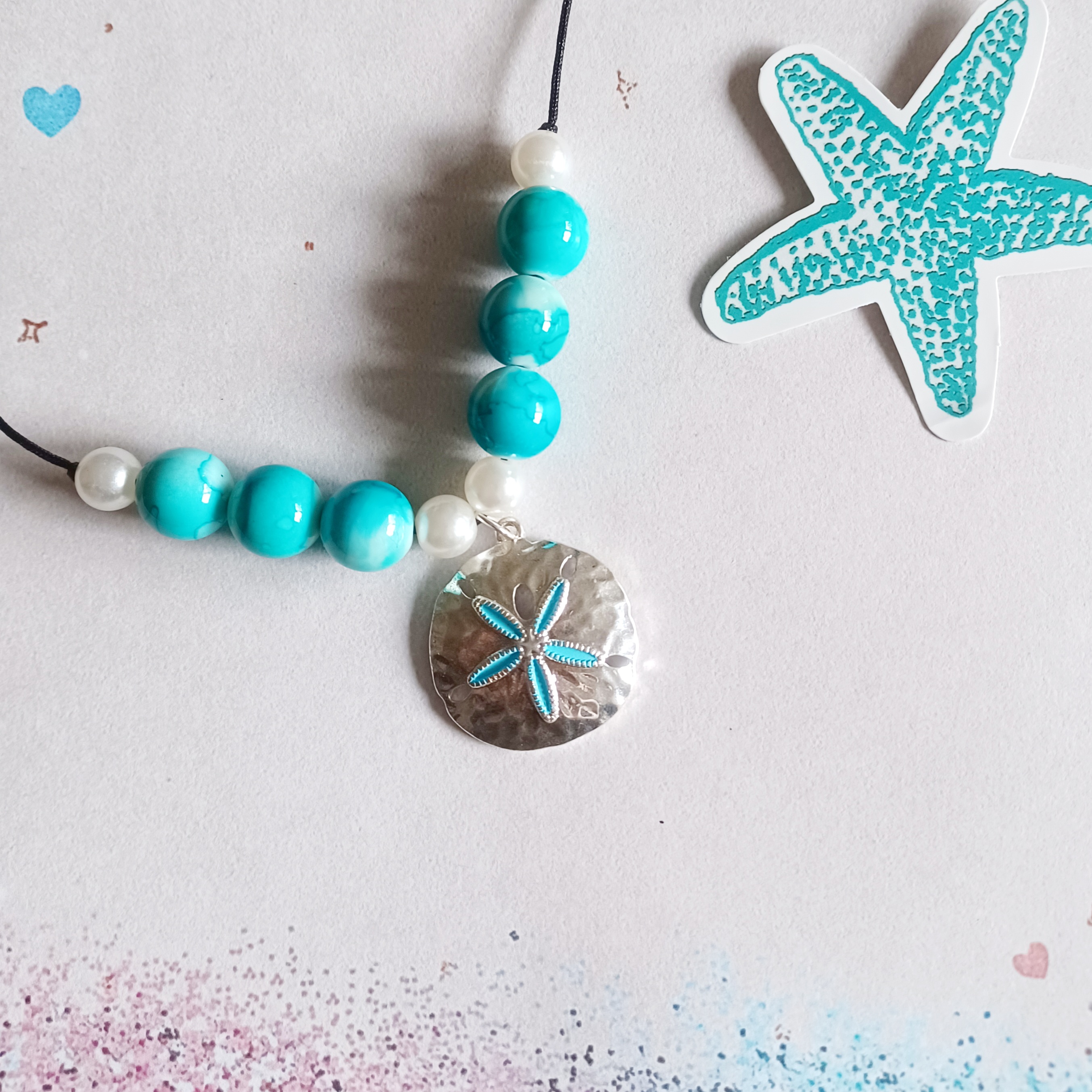 A silver sand dollar charm on a nylon cord with marbled turquoise-colored beads and faux white pearls.