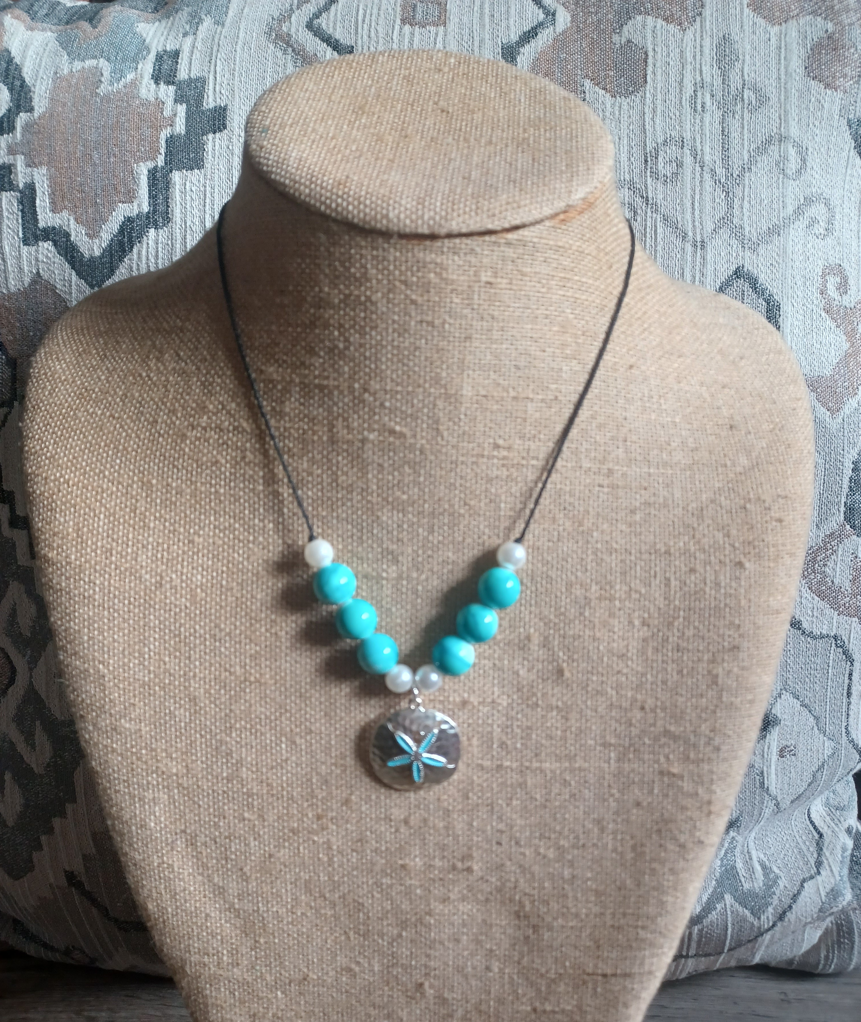 "Shoreline" silver sand dollar and turquoise color necklace OOAK