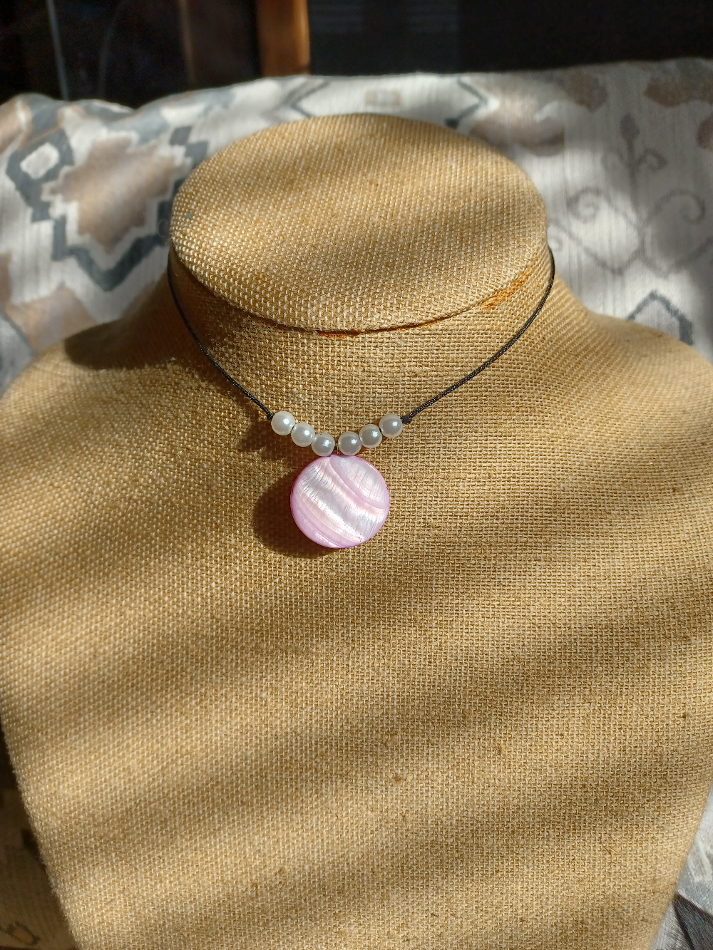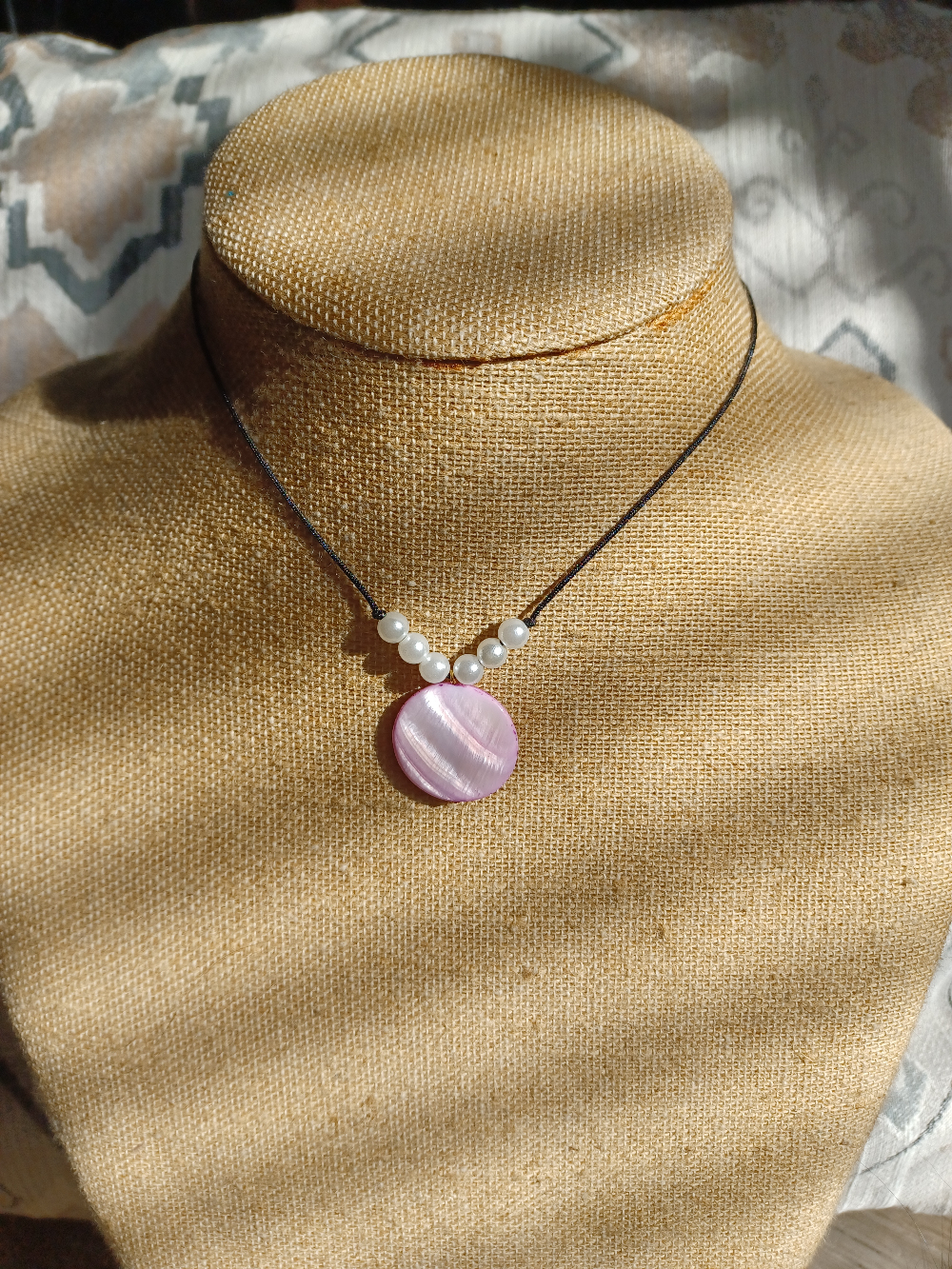 A quarter-sized pink shell pendant accompanied by 6 faux pearls on a nylon cord.