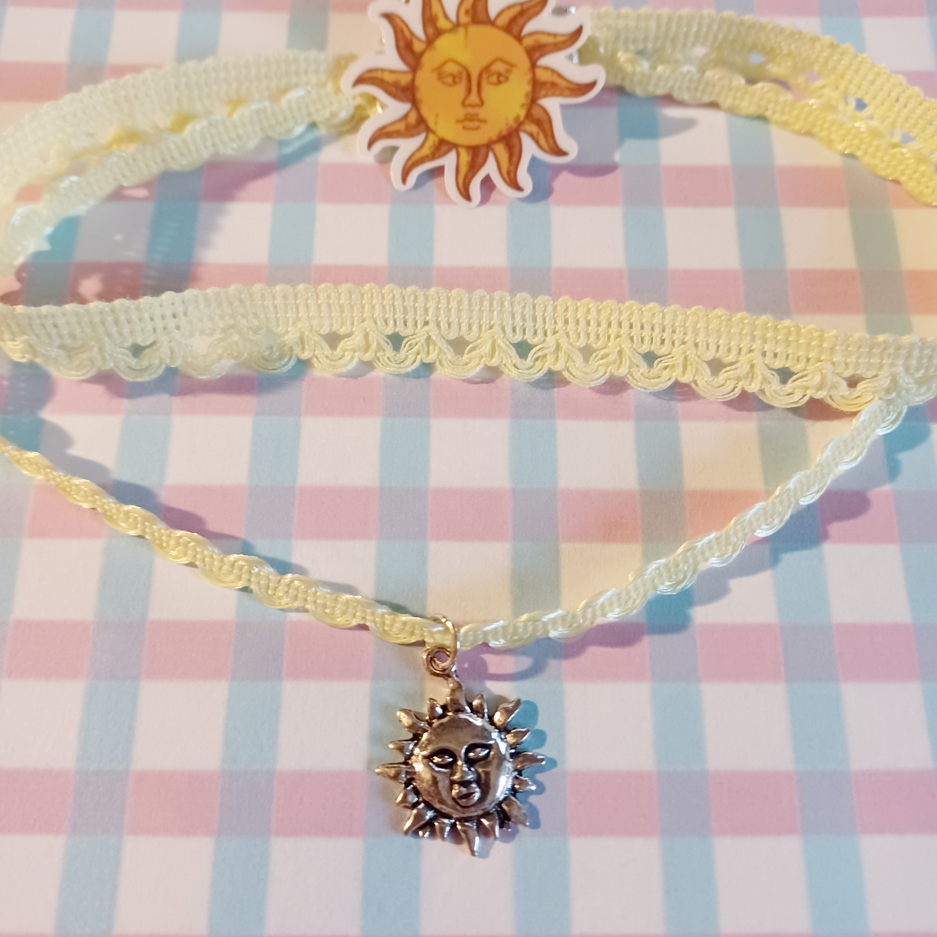 A yellow choker made with two ribbons and a cute sun charm. <3